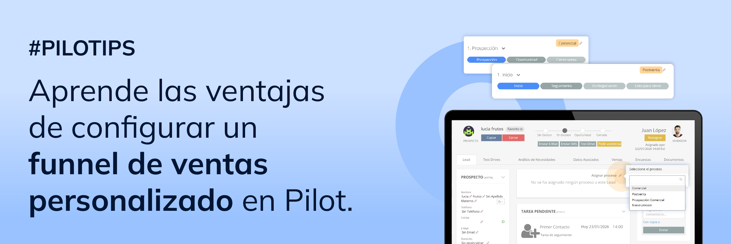 Un funnel de ventas personalizable es clave para maximizar la conversión. Con Pilot puedes diseñar el recorrido del prospecto y acelerar el proceso comercial en leads avanzados, como los provenientes de un showroom.