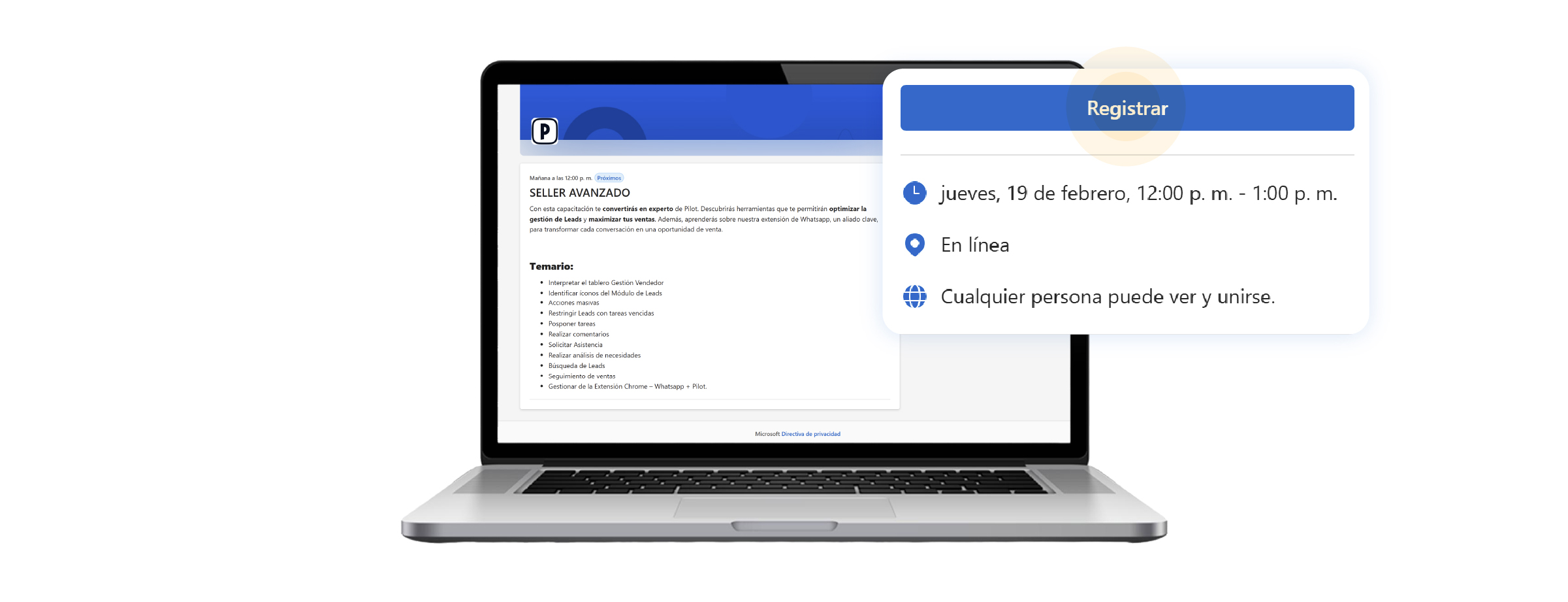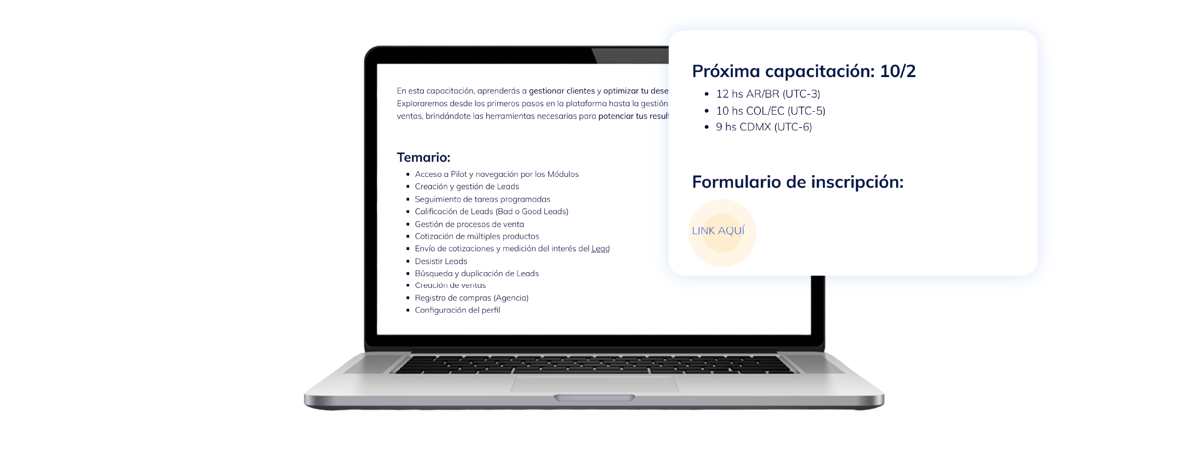Las capacitaciones son formaciones gratuitas, mensuales y en vivo que te permitirán desarrollar tu potencial y dominio de Pilot. Con ellas podrás certificarte, tener constancia de tu conocimiento y mantenerte actualizado sobre las nuevas funcionalidades del CRM.